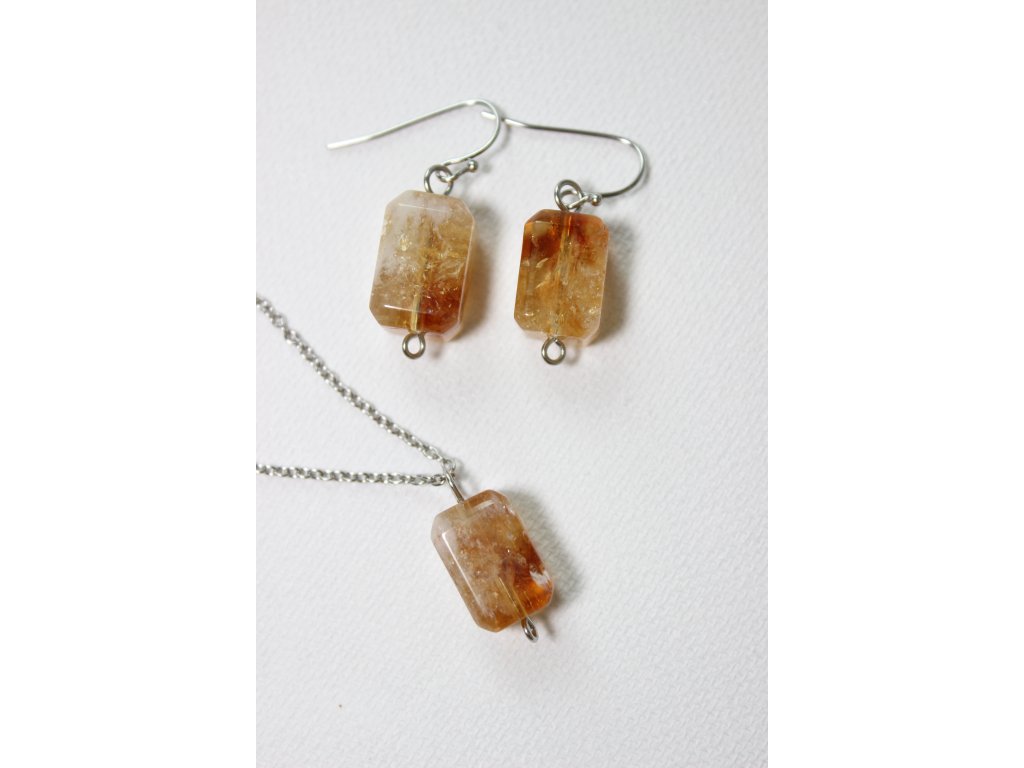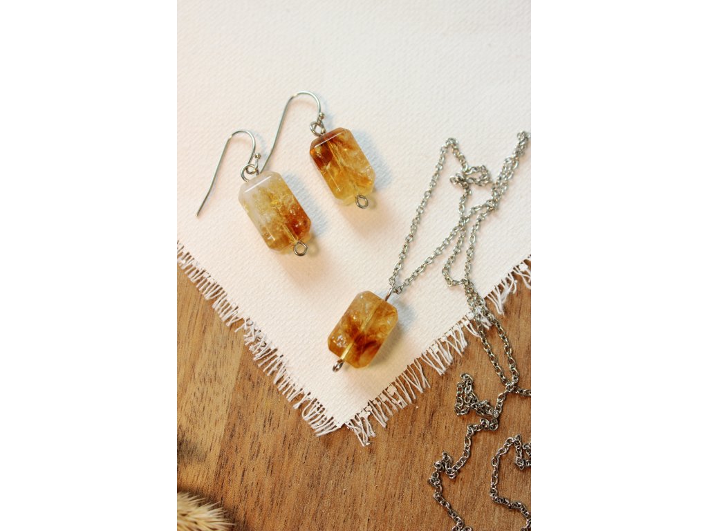 Set s prírodným citrínom, ktorý spája náhrdelník a náušnice do harmonického celku. Teplý zlatistý odtieň kameňa pôsobí prirodzene a žensky.