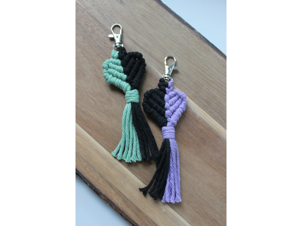 Makramé kľúčenka vyrobená ručne, zakončená kovovou karabínou. Slúži na uchytenie kľúčov alebo ako jednoduchý doplnok na batoh či tašku. Super ako valentínsky darček.