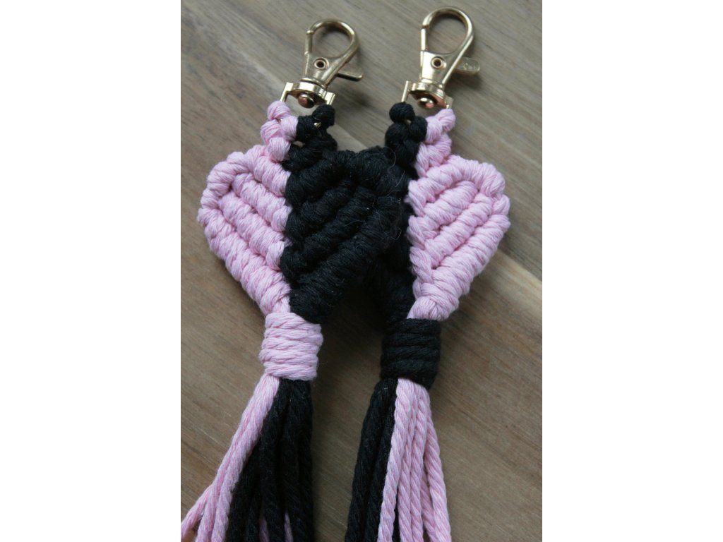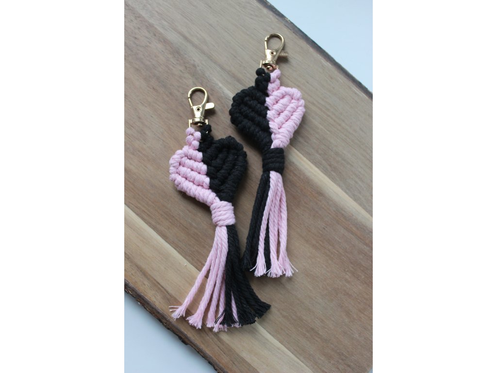Makramé kľúčenka vyrobená ručne, zakončená kovovou karabínou. Slúži na uchytenie kľúčov alebo ako jednoduchý doplnok na batoh či tašku. Super ako valentínsky darček.